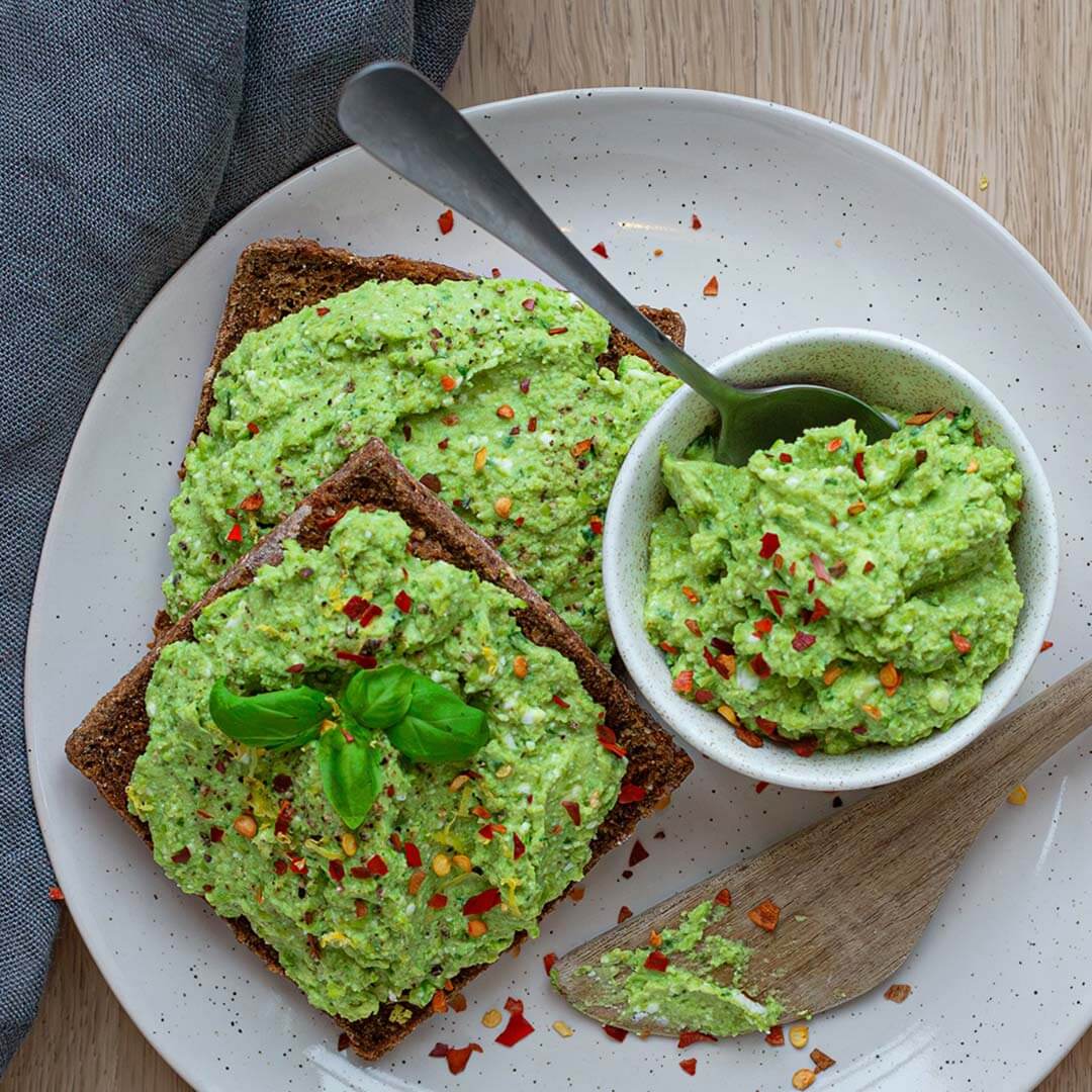 Mixa alla ingredienser med en stavmixer och bred ut röran på en skiva Surdegsruta.