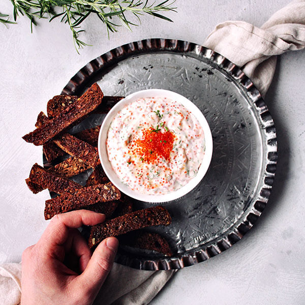 (No Ratings Yet)Festlig dipp som du enkelt blandar ihop av crème fraiche, kaviar, dill, citron och finhackad rödlök. Servera med krispiga brödpinnar som du gör av vårt Grova Surdegsbröd.