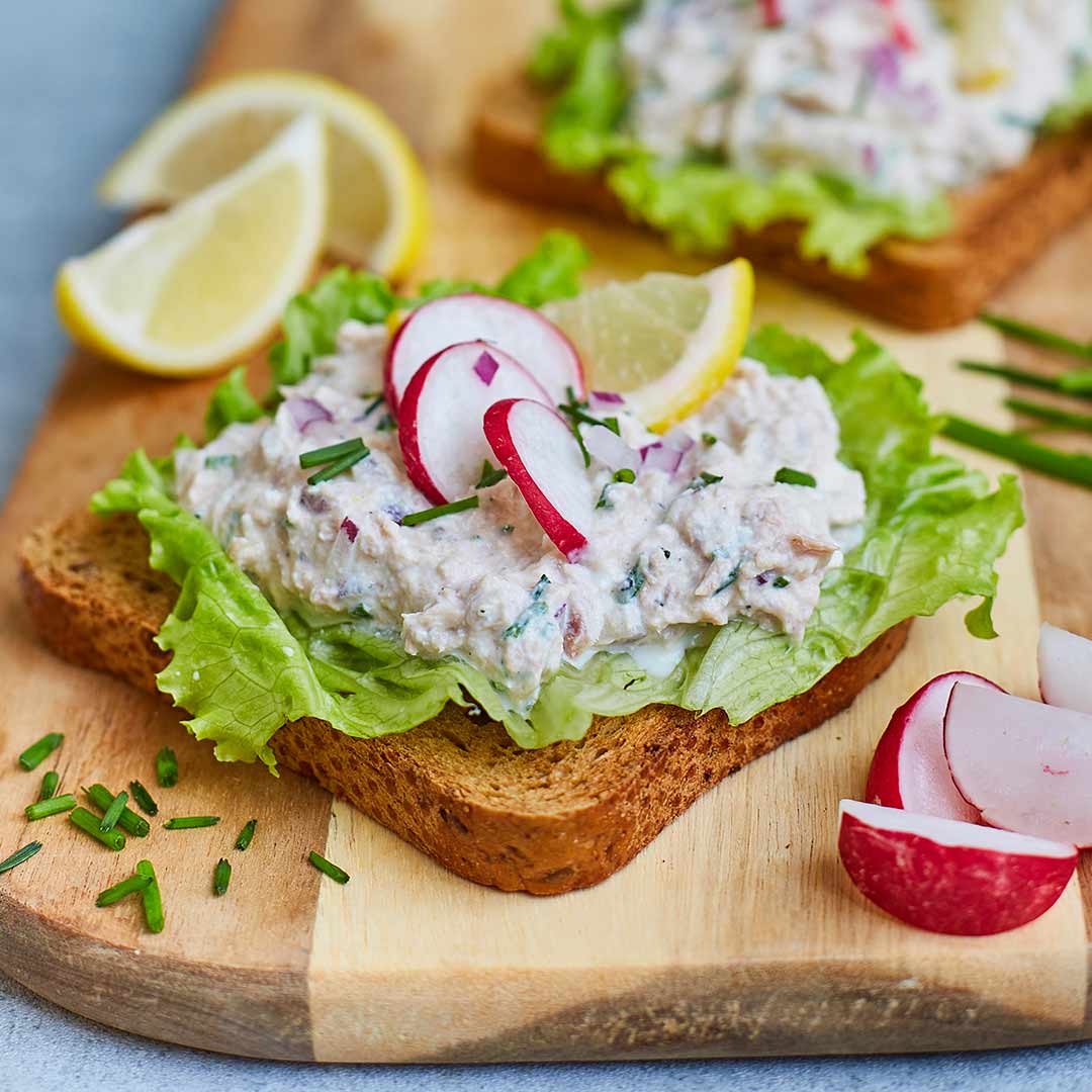 Mixa keson och blanda i turkisk yoghurt och avrunnen tonfisk. Riv i citronskal och bland i tillsammans med lite pressad citronsaft. Addera flytande honung och finhackad rödlök och gräslök, smaka av med salt och peppar. Rosta Fria Grova och placera ett salladsblad på varje macka. Klicka på tonfiskröran och toppa med tunna skivor rädisa, lite gräslök och en citronskiva.