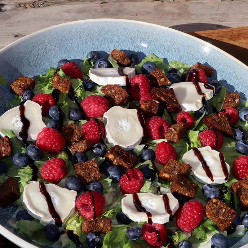 Äntligen sommar! Här kommer ett recept som är framtaget i samarbete med Linda ”Glutenfria köket” Filipsson, för varma dagar och ljusa kvällar. En fräsch sommarsallad med krämig getost och söta bär, toppad med smakrika honungskrutonger gjord på vårt grova surdegsbröd. Passar perfekt till både förrätt och varmrätt, som något gott att bjuda på eller behålla helt för sig själv.
