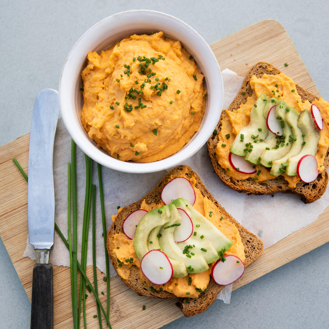 Stek brödskivorna gyllene i smör i en varm stekpanna. Bred hummus på brödskivorna och toppa med skivad avokado, rädisor och gräslök.
