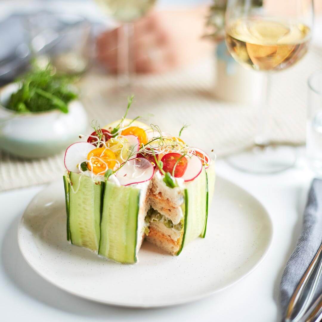 Skäm bort någon (eller dig själv) med denna veganska smörgåsbakelse som är lika god som den är vacker att titta på. Inne i bakelsen gömmer sig två smakrika och krämiga fyllningar med röd pesto och gröna ärter. Den är också enkel att göra till en smörgåstårta eller landgång genom att bara addera mer av det goda!