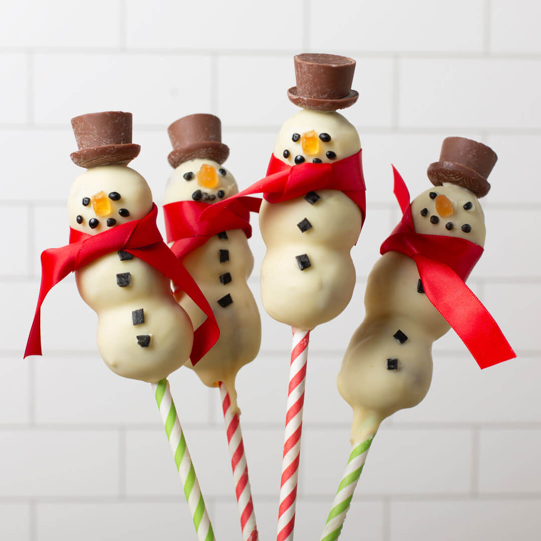 Smält den resterande vita chokladen i vattenbad eller mikrovågsugn. Doppa sedan varje snögubbe i chokladen och placera i ett glas eller lägg på en tallrik.