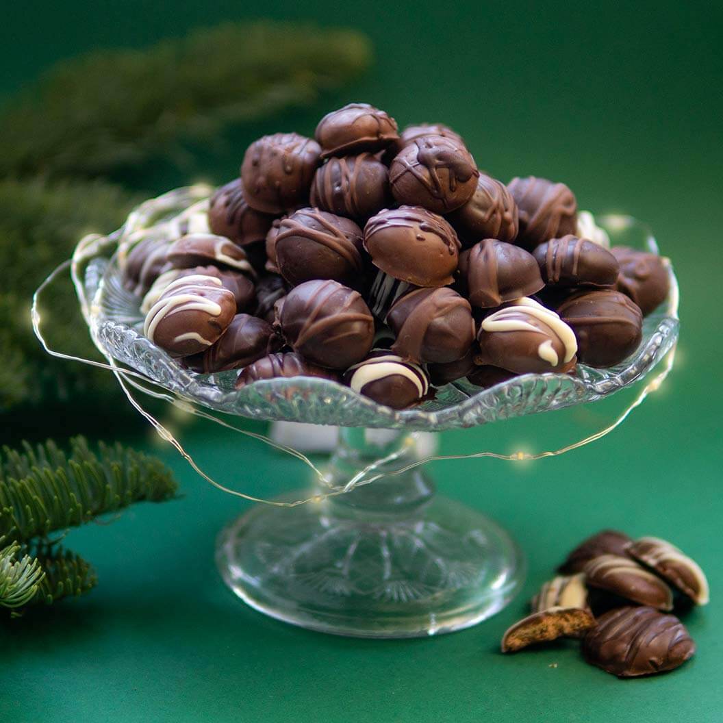 Forma vår glutenfria pepparkaksdeg till små bollar, bara lite större än ärtor. Lägg dem på bakplåtspapper och baka i ca 6-8 minuter på 200 C (varmluft). Lyft av bakplåtspappret från plåten och låt knapparna svalna. Doppa knapparna i smält choklad (det är lite pilligt men två tandpetare är bra att använda som verktyg ). Placera på bakplåtspapper och låt stelna. För extra finess kan du ringla över choklad i en annan färg med hjälp av en tesked. Förvara gärna pepparkaksknapparna i en burk i kylskåp.