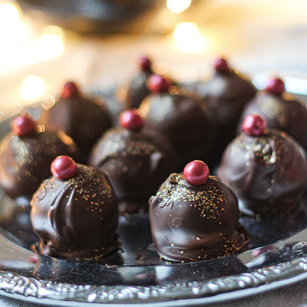 Baka ut och grädda Frias pepparkaksdeg enligt instruktion på förpackning. Krossa/mixa de färdigbakade pepparkakorna och blanda med färskost till en deg. Rulla små kulor av degen och lägg in dem i kylen tills de har stelnat ordentligt. Smält chokladen i micron eller över vattenbad. Doppa pepparkakskulorna i chokladen med hjälp av tex en gaffel eller två tandpetare som verktyg. Dekorera kulorna med valfritt glutenfritt pynt och förvara dem sedan i kylen.