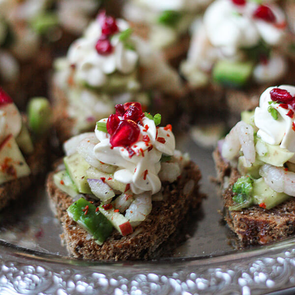 Finhacka avokado, äpple och rödlök. Blanda med räkor och addera limejuice och kryddor efter smak. Skär av kanterna på brödskivorna och skär sedan skivorna i mindre bitar. Lägg räkröran på brödbitarna och garnera med crème fraiche som är smaksatt med honung, lime och salt/peppar. Toppa det hela med finklippt gräslök och granatäpplekärnor.