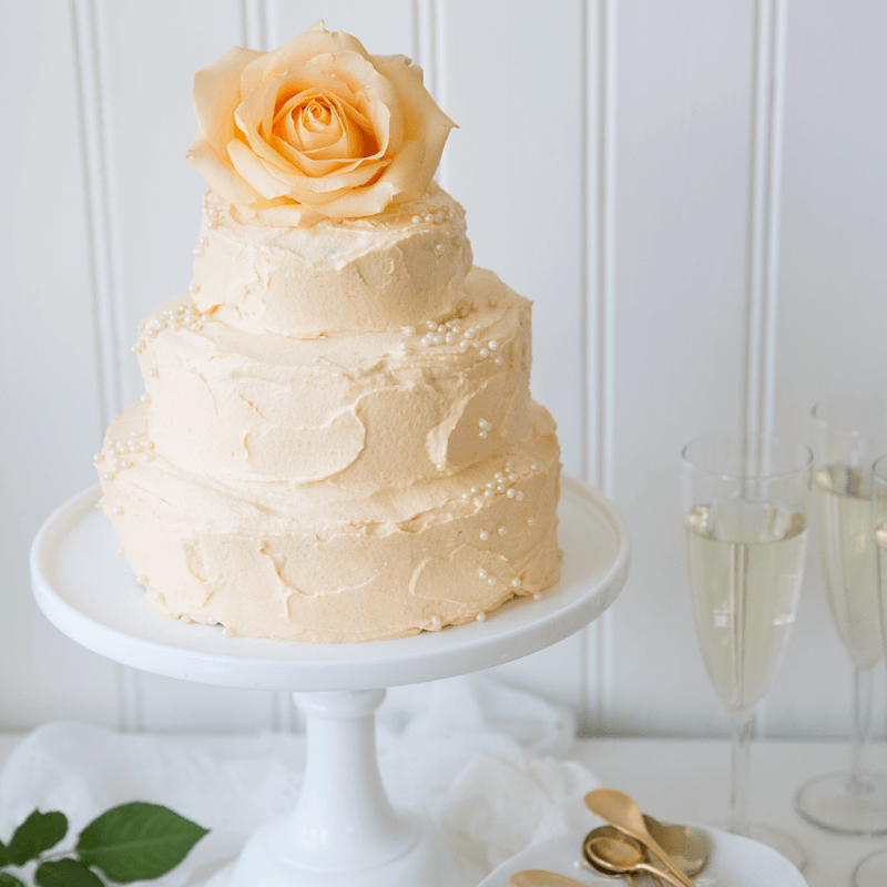 Täck hela tårtan med aprikosmousse och garnera med en ros eller en fin bröllopsdekoration.