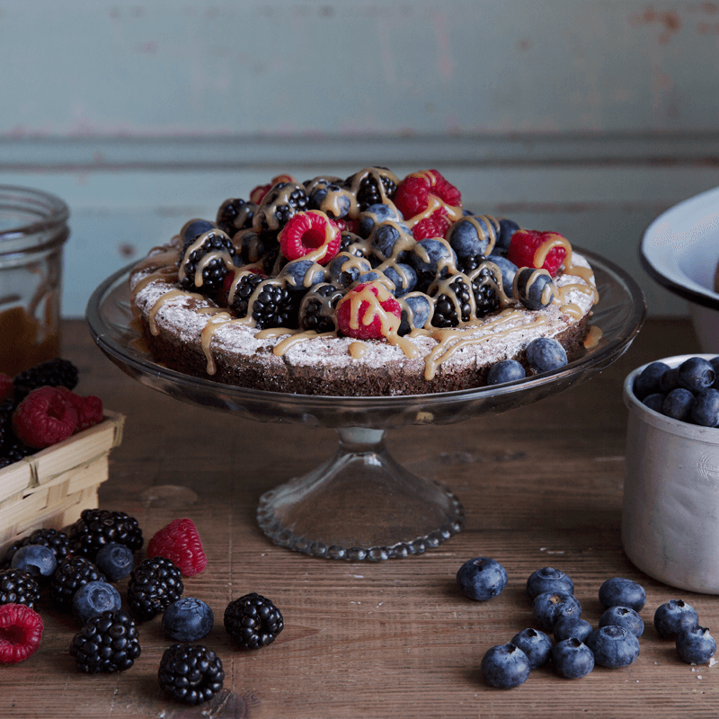 Lägg Frias glutenfria kladdkaka på ett fat och toppa med bär och kolasås.