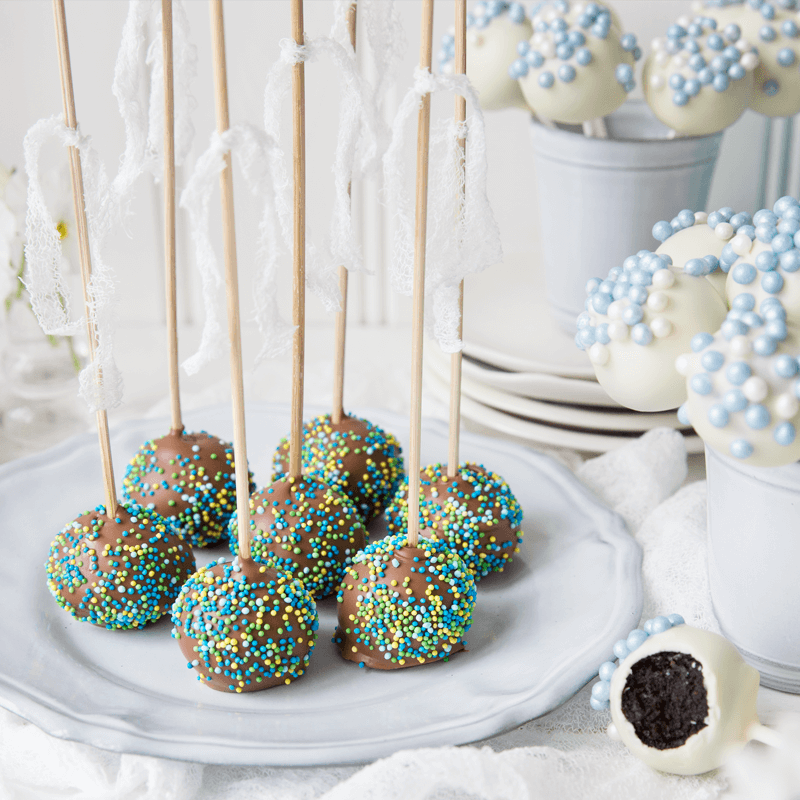 Cake Pops är ett trevligt litet runt bakverk på pinne. Kort och gott kan man säga att det är som är en godisklubba. Och en chokladkaka. Och en efterrätt. Allt gott i ett helt enkelt. I vårt recept på glutenfria Cake Pops så har vi använt oss av Fria Kladdkaka som bas.
