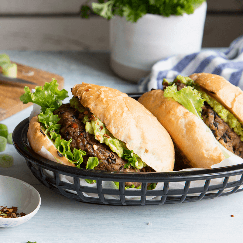 Servera med Fria Hamburgerbröd, sallad, mosad avokado och chiliflakes.