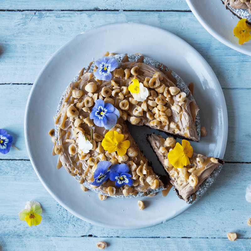 Lägg ihop de glutenfria kladdkakorna och ringla kolasåsen över. Dekorera med ätbara blommor.