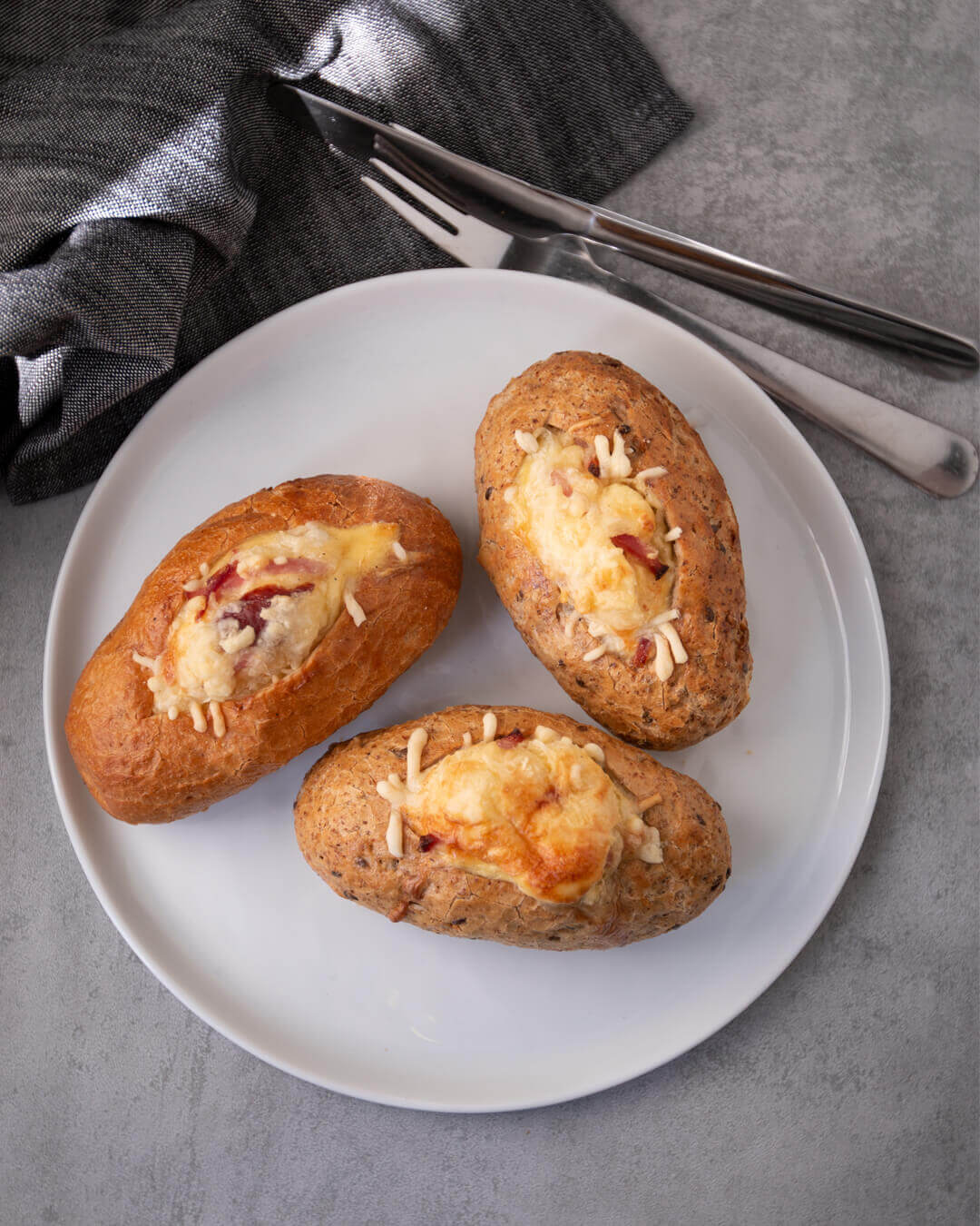 Placera baguetterna på folie och se till att de inte lutar. Ställ in i ugnen i ca 20–25 minuter, eller tills fyllningen har stelnat och fått fin färg. Ta ut och toppa eventuellt med lite extra ost. Låt svalna något innan servering, bli förundrad över din tjusiga skapelse och hugg in!