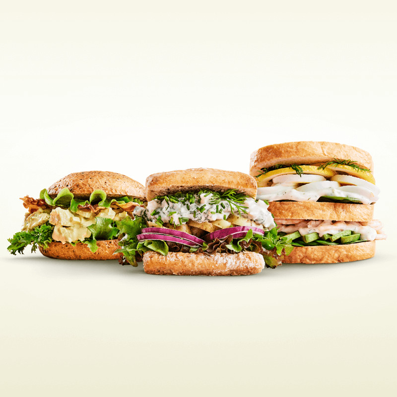 Fördela alla pålägg mellan Fria Vita Toast i tre lager;