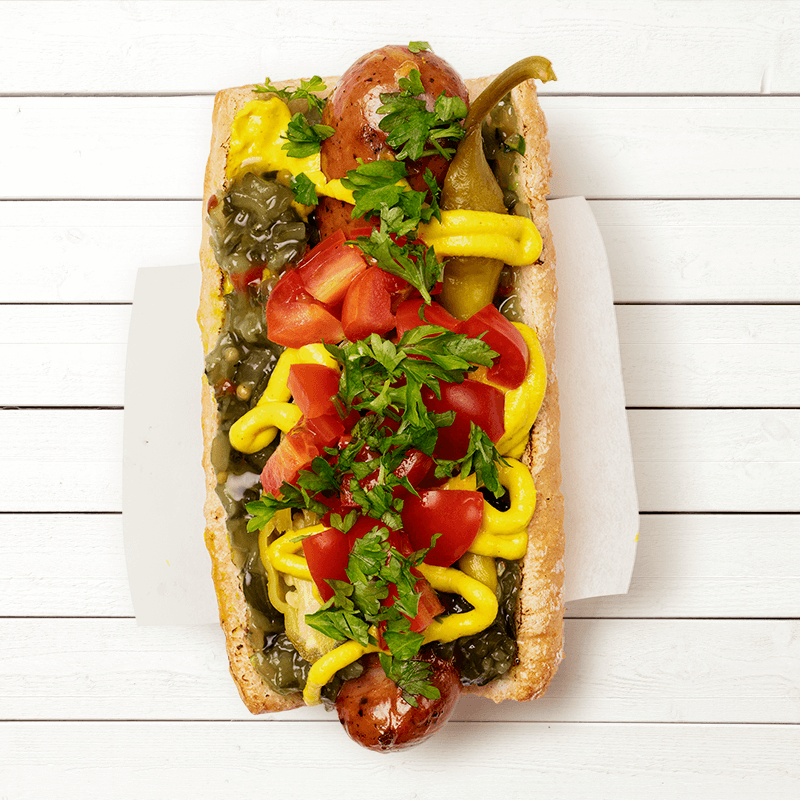 Toppa korven med bostongurka, senap, tomaterna, feferoni och avslutad med hackad persilja.
