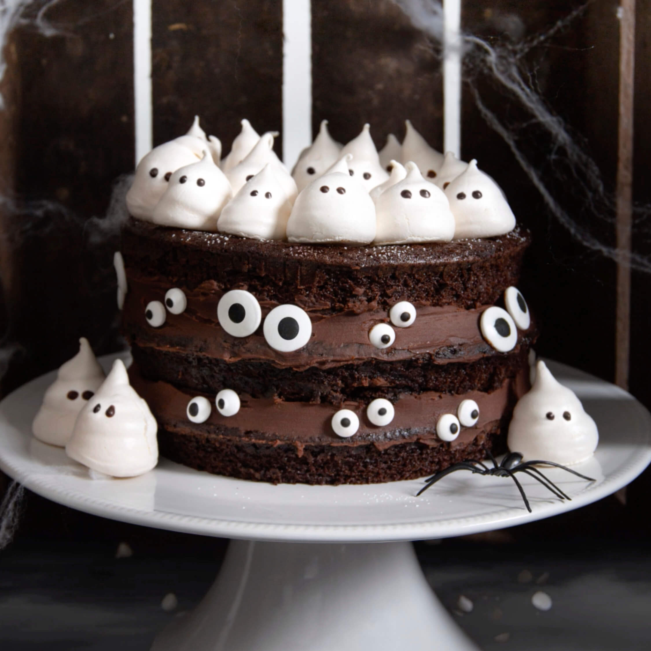 Lägg sedan nästa lager kladdkaka ovanpå, följt av ytterligare ett lager chokladganache. Därefter lägger du sista lagret kladdkaka. Toppa hela kalaset med marängspöken och fäst godisögon på sidan av kladdkakan för en extra läskig effekt!