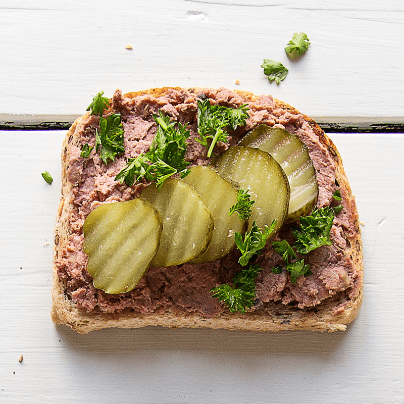Bred leverpastej av god kvalitet på brödet och toppa med inlagd skivad gurka och grovt hackad persilja.