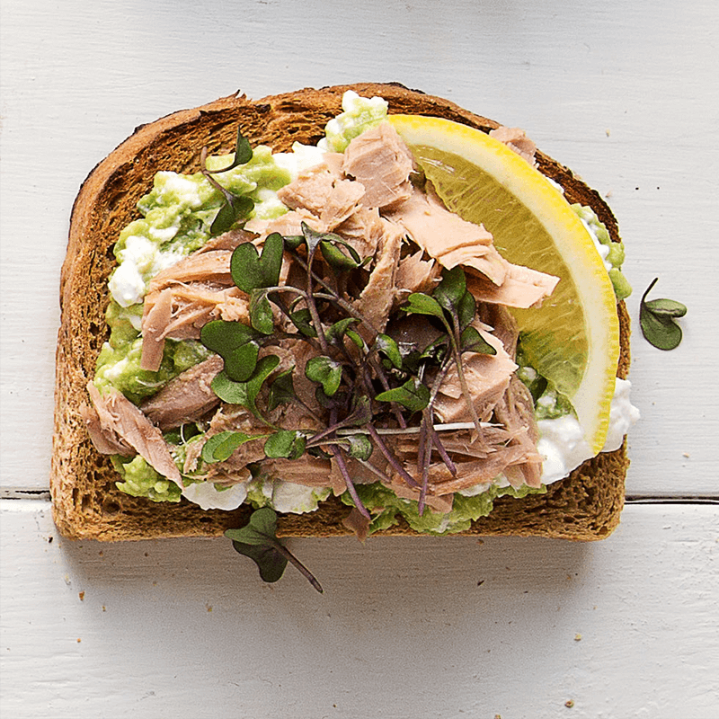 Mosa avokadon med en gaffel och blanda med keso. Lägg röran på brödet och toppa med tonfisk, groddar, citron samt salt och peppar.