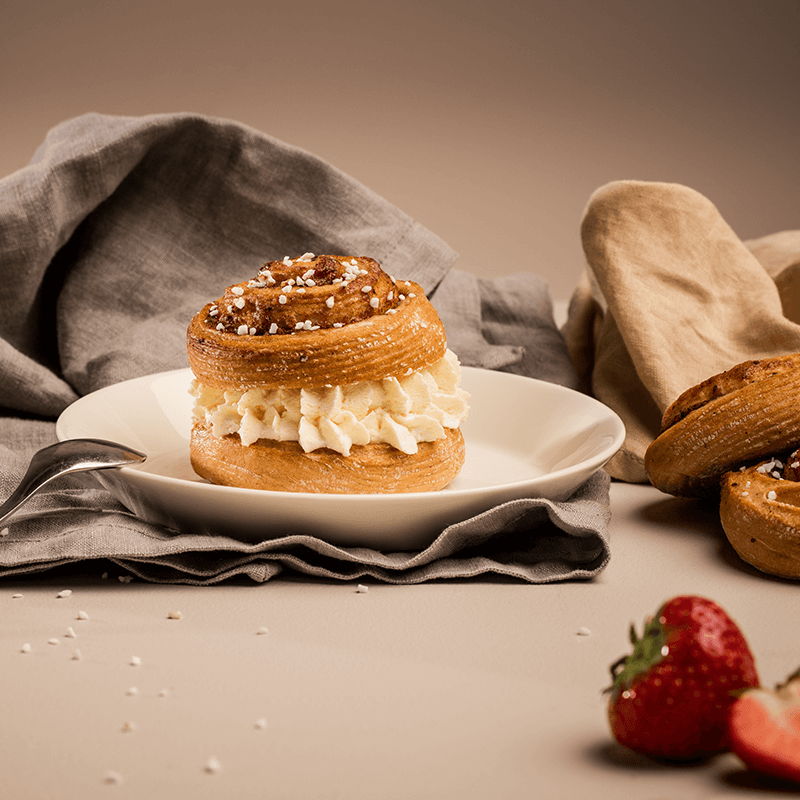Lägg samman semlorna: spritsa önskad mängd fyllning i urgröpta kanelbullar. Toppa med vispad grädde och lägg på locket. Avsluta med att pudra över florsocker.